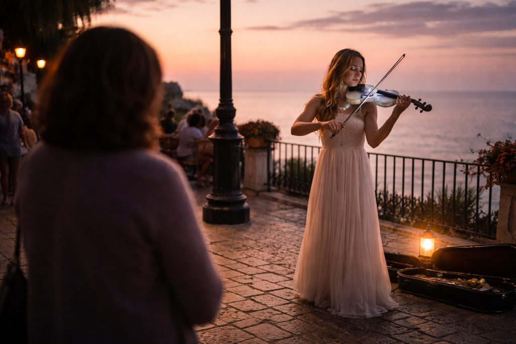 It would have been my thirtieth birthday on the 21st of September 2022. On the 22nd, Mum and Dad were strolling around the town centre. Having reached Balcon De Europa, the mesmerising sound of an electric violin drew them further in. And there she was, a stunning young woman wearing a long white gown, as if dressed for a magnificent venue such as The Royal Albert Hall. Her name is Klara Gomboc.